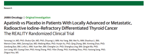 2021年12月16日,权威医学杂志《JAMA Oncology》(影响因子31.777)在线发表阿帕替尼的一项III期临床研究(REALITY)——甲磺酸阿帕替尼片治疗局部进展/转移性放射性碘难治性分化型甲状腺癌(RAIR-DTC)患者的多中心、随机、双盲、安慰剂对照临床研究。此研究由北京协和医院的林岩松教授和南京金陵医院的秦叔逵教授发起,在全国21个研究中心展开,由DB真人医药中央医学事务部团队支持完成。