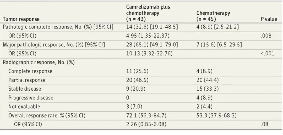北京时间8月3日,DB真人医药创新药卡瑞利珠单抗联合化疗(Cam+CT)对比化疗(CT)新辅助治疗ⅢA/ⅢB (T3N2) 期非小细胞肺癌(NSCLC)结果在线发表于国际权威期刊JAMA Oncology[1]。该研究是由空军军医大学唐都医院姜涛教授、雷杰教授团队联合陕西省肿瘤医院雷光焰教授团队、兰州大学第二附属医院王成教授团队共同参与的一项随机对照、多中心、Ⅱ期临床研究(TD-FOREKNOW,NCT04338620)。研究结果显示,与化疗相比,卡瑞利珠单抗联合化疗新辅助治疗NSCLC显著提高了病理完全缓解(pCR)率(32.6% vs 8.9%,OR=4.95,95% CI :1.35-22.37, P =0 .008),且安全性良好。本研究是卡瑞利珠单抗新辅助治疗可切除NSCLC患者的首个随机对照研究,为NSCLC新辅助免疫治疗再添新证。