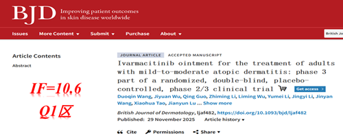 [1] Duoqin, Wang,Jiyuan, Wu,Qing, Guo et al. Ivarmacitinib ointment for the treatment of adults with mild-to-moderate atopic dermatitis: phase 3 part of a randomized, double-blind, placebo-controlled, phase 2/3 clinical trial. Br J Dermatol, undefined(0), . doi:10.1093/bjd/ljaf482.